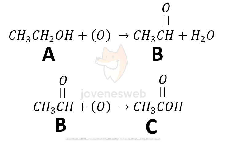 El grupo funcional, característico en cada molécula de la reacción, permite afirmar que la molécula C responsable de un sabor y olor agrios, en los vinos, forma parte de la familia de los ________, mientras que el compuesto A que se está oxidando en presencia de aire pertenece a la familia de los ________ y el compuesto B es un intermediario que forma parte de los compuestos oxigenados.