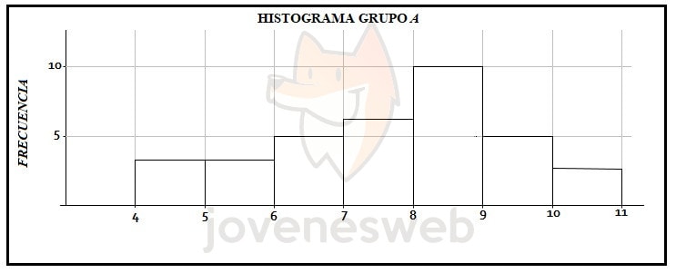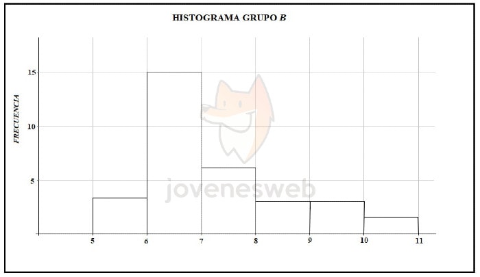 Se mide el tamaño, en centímetros, de varias hojas de dos árboles A y B, y se construyen los histogramas para el grupo A y para el grupo B, como se muestra en las figuras: